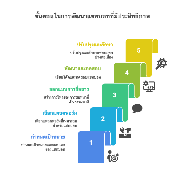 สำหรับองค์กรที่ต้องการพัฒนาแชทบอทสำหรับองค์กร ให้สามารถทำงานได้อย่างมีประสิทธิภาพ จะมีขั้นตอนการออกแบบ และพัฒนาโดยคร่าว ๆ 5 ขั้นตอน ดังนี้