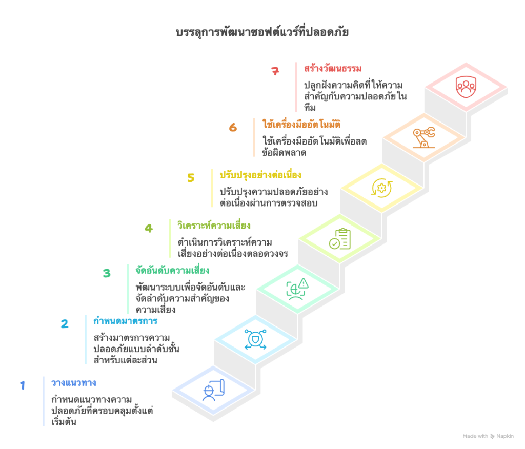 สำหรับแนวทางการพัฒนาซอฟต์แวร์ให้สามารถทำงานได้อย่างปลอดภัย และมีประสิทธิภาพ แบ่งออกเป็น 7 ขั้นตอน ดังนี้