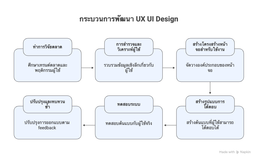 กระบวนการพัฒนา UX UI Design เป็นขั้นตอนที่มีความละเอียดรอบคอบ เพื่อให้ผลลัพธ์สุดท้ายตอบโจทย์ความต้องการของผู้ใช้มากที่สุด ทุกขั้นตอนล้วนมีบทบาทสำคัญในการสร้างซอฟต์แวร์หรือเว็บไซต์ที่ใช้งานง่าย มีประสิทธิภาพ ดังนี้